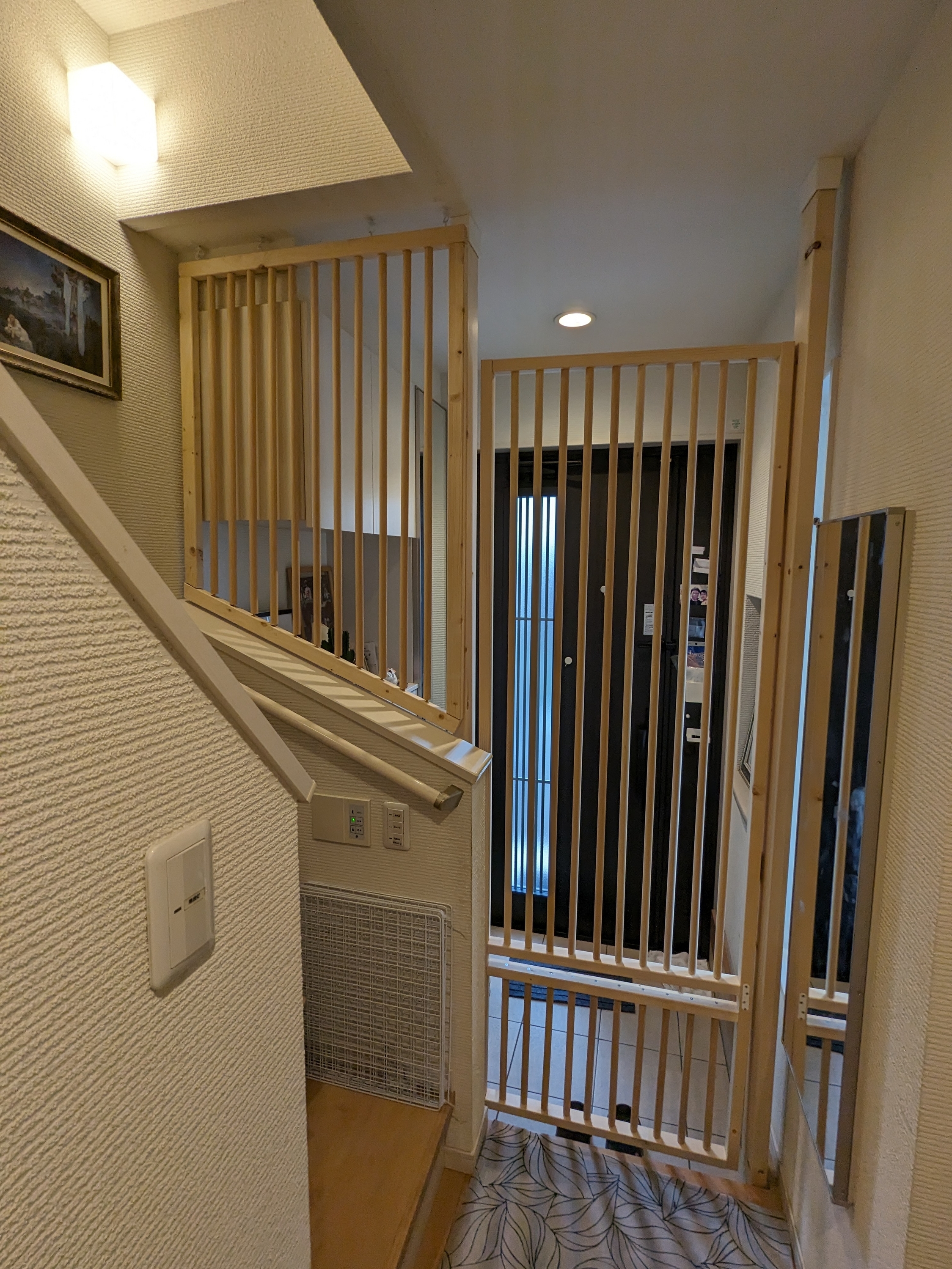 家猫は外に出さないらしい。脱走すると捜索困難になるようなので、玄関に脱走防止柵を設置した。玄関すぐに階段があるため、既製品が合わず、DIYすることになった。